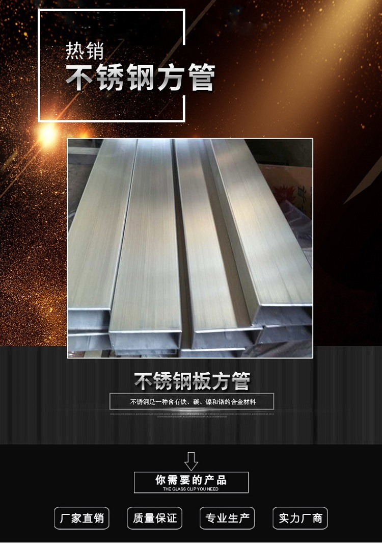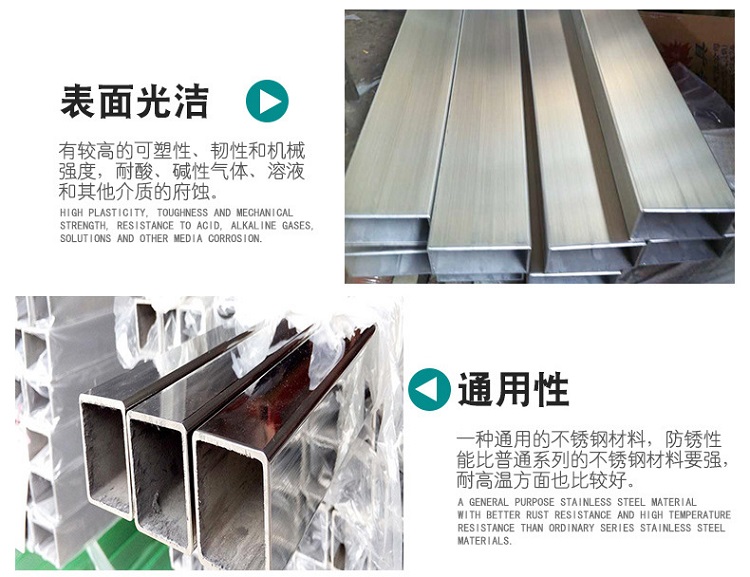 304不锈钢方管是一种中空的长条钢材,因为截面是正方形所以叫做方管。大量用作输送流体的管道,如石油、天燃气、水、煤气、蒸气等,另外,在搞弯、抗扭强度相同时,重量较轻,所以也广泛用于制造机械零件和工程结构。